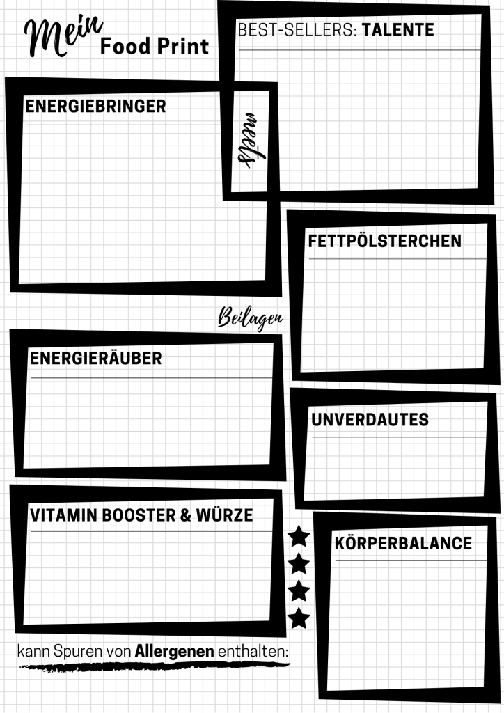 Also wie erwähnt, wir kennen unseren Status Quo. Den können wir auch gerne schriftlich fixieren. Als Beispiel können wir den unten stehenden „Food Print“ nutzen.